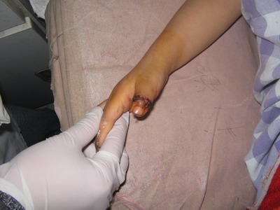 小雨洁跟随着父母到工厂打工,不慎被机器压伤,25日下午4:25分父母急送来院,当时伤势十分严重,神经、血管、肌腱全部离断,右拇指血肉模糊,按常规只能作截指处理,而一旦拇指缺损,不仅会使患儿的心灵受到严重的创伤,而且对家庭也带来了沉重的负担。为此,我院领导班子迅速展开了术前讨论,精心准备及确定了手术方案,半小时后,马主任为小雨洁急症行:右拇指清创、再植术,经过4个小时的精心手术,分别修复了指骨、肌腱、神经、血管等组织,特别是血管,其中两根血管在显微镜放大12倍的情况下,用1/2的缝合线尽可能缝合4针,才予以恢复,手术中克服了血管条件差、管壁脆等困难,终于取得了成功。
